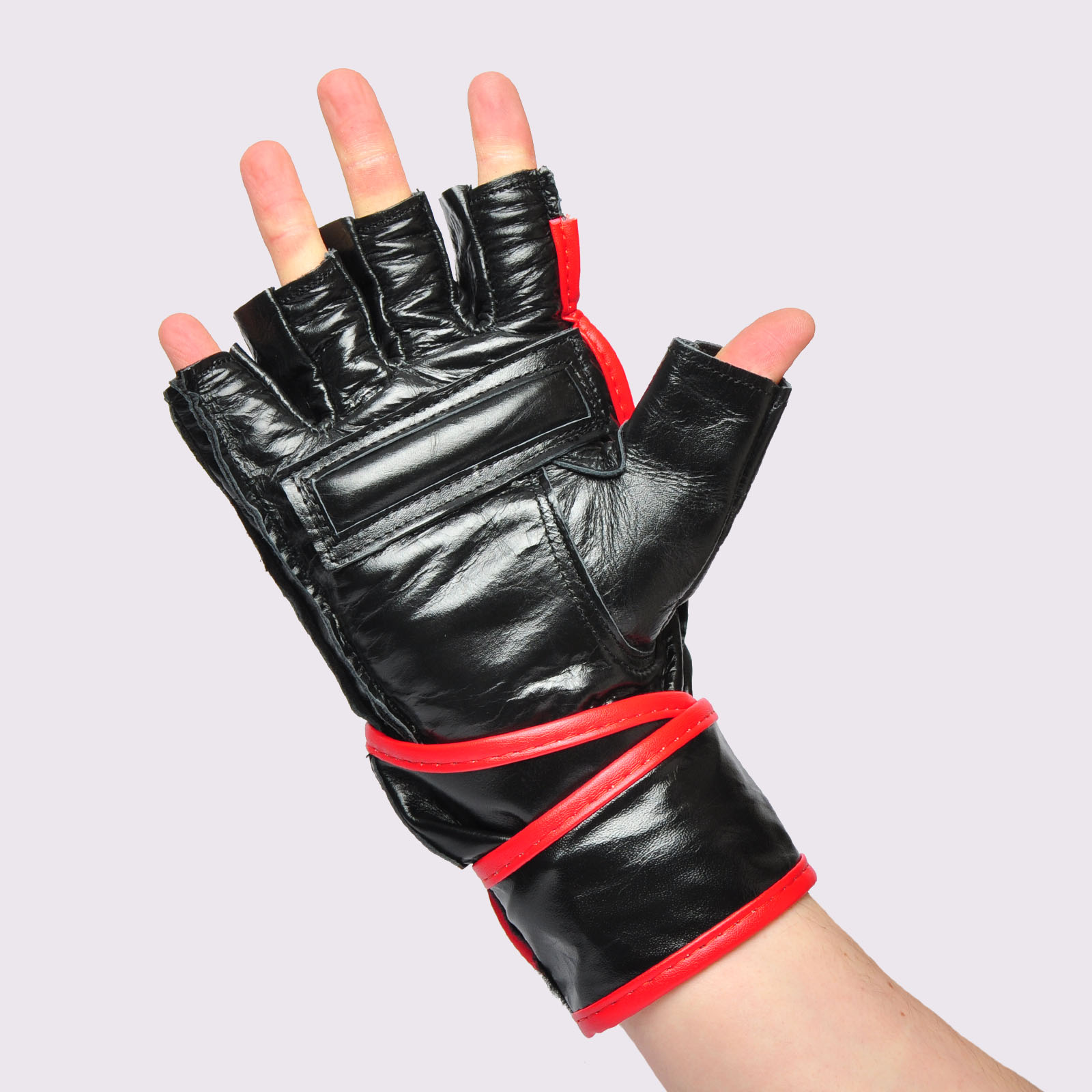 Quality hide leather fingerless glove with wrap around wrist strap for great security and wrist support. Well padded for a fingerless glove, great for comfort and training for speed punching.